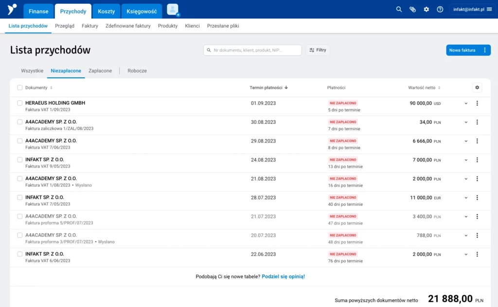 Odpowiadając na potrzeby naszych Użytkowników, wprowadziliśmy nowość w aplikacji inFakt. W sekcji Przychody dodaliśmy zakładkę Lista przychodów. Zbieramy w niej wszystkie faktury przychodowe – dzięki temu wszystkie dokumenty masz w jednym miejscu. Możesz dowolnie je filtrować, sumować i wyszukiwać. Sprawdź szczegóły nowego widoku.