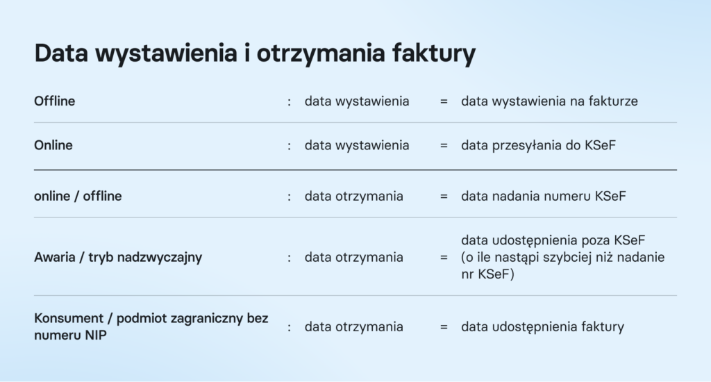 Krajowy System e-Faktur wprowadza nowe zasady związane z datą wystawienia faktury. Co do zasady fakturę ustrukturyzowaną (e-fakturę) uznaje się za wystawioną w momencie wysłania jej do systemu, a dokładnie w momencie nadania numeru KSeF. Nie wtedy, gdy wystawisz ją lokalnie, w swoim programie czy zapiszesz w wersjach roboczych, ale dopiero po wysłaniu jej do KSeF i nadaniu numeru KSeF. Wyjątkiem będą faktury wystawione w trybach offline. Piszemy o nich w kolejnym akapicie.