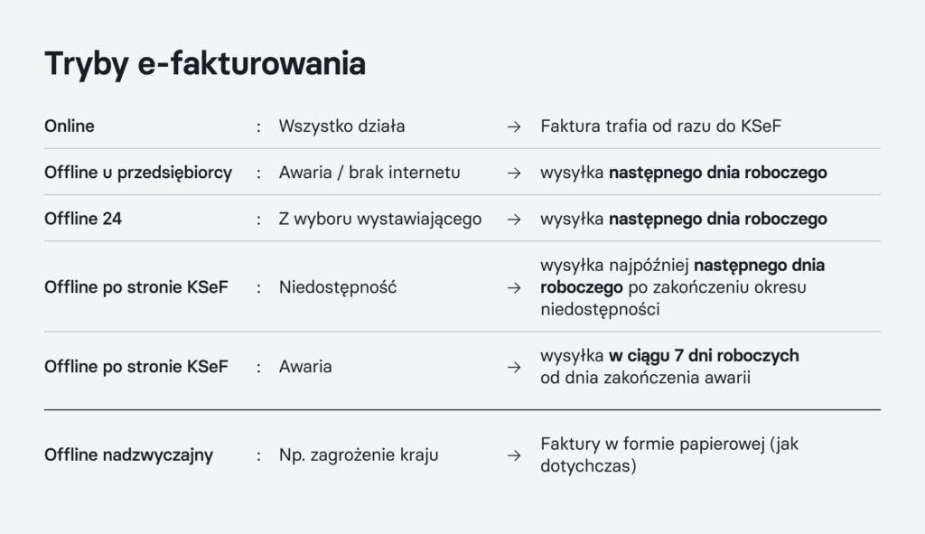 - Tryb awaryjny – tryb przewidziany w razie awarii KSeF. Jeśli takie zdarzenie zostanie ogłoszone, możesz wystawić fakturę w systemie w trybie awaryjnym, według obowiązującej struktury i masz 7 dni po usunięciu awarii na przesłanie dokumentu do KSeF. Datą wystawienia będzie data wskazana przez Ciebie na fakturze