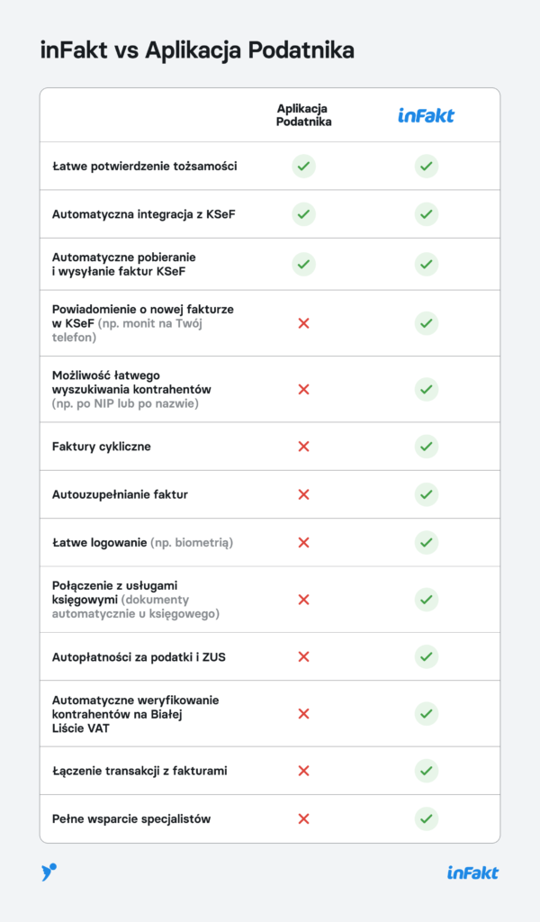 Jak korzystać z KSeF? Na przykład przez stronę rządową – Aplikację Podatnika. Jest ona jednak dość podstawowym narzędziem o ograniczonych możliwościach. Szczególnie przy większej liczbie dokumentów i bardziej skomplikowanej księgowości korzystanie z niej może okazać się bardzo trudne. Za każdym razem do rządowego rozwiązania trzeba będzie logować się też Profilem Zaufanym, a do aplikacji inFakt wygodnie, np. biometrią. Podstawowe narzędzia (Aplikacja Podatnika KSeF czy e-mikrofirma dla JDG) nie informują o nowych dokumentach, a samo wystawienie faktury jest czasochłonne. Dlatego też warto korzystać tu ze zintegrowanych programów księgowych.