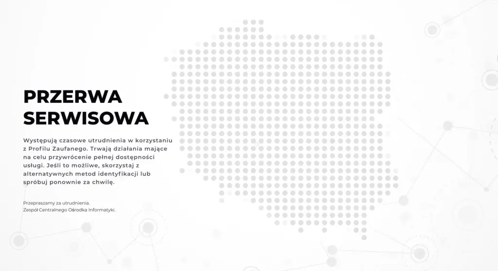 Występują czasowe utrudnienia w korzystaniu z Profilu Zaufanego. Trwają działania mające na celu przywrócenie pełnej dostępności usługi. Jeśli to możliwe, skorzystaj z alternatywnych metod identyfikacji lub spróbuj ponownie za chwilę.