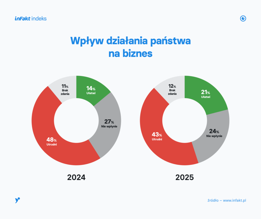 Według najnowszego badania inFakt indeks 2025, aż 48% przedsiębiorców krytycznie ocenia działania państwa wobec firm, podczas gdy jedynie 14% dostrzega realne ułatwienia. Wielu przedsiębiorców podkreśla potrzebę bardziej stabilnych przepisów oraz dłuższego vacatio legis dla wprowadzanych zmian, co pozwoli im lepiej planować swoje działania biznesowe.