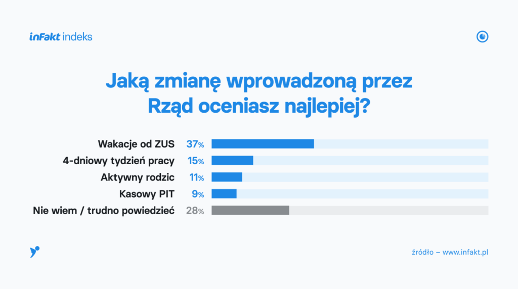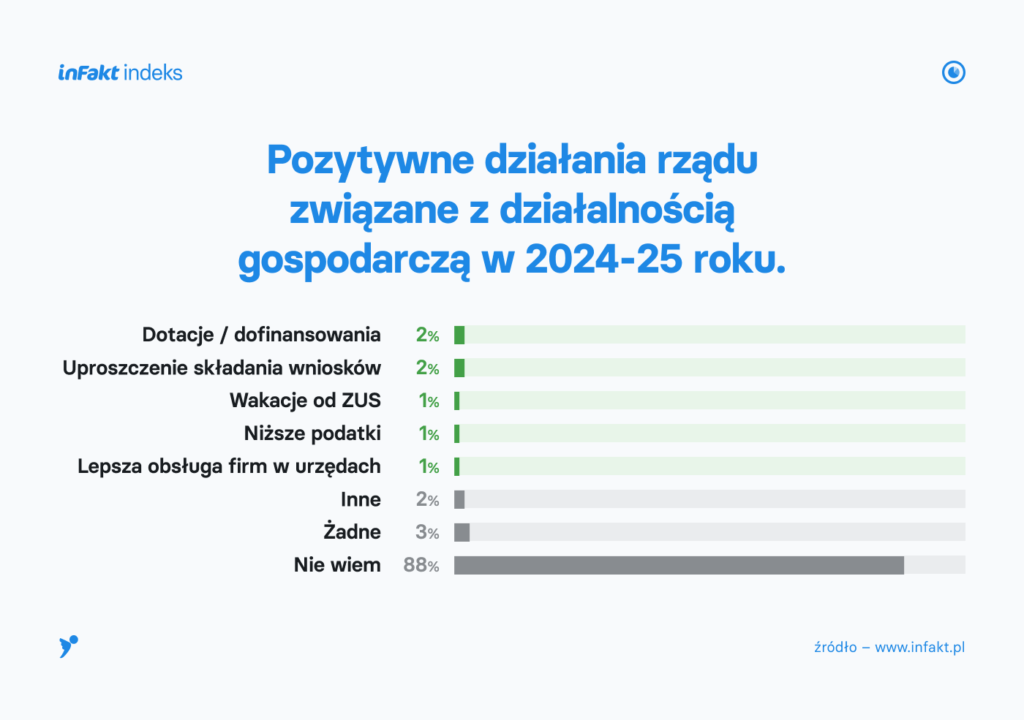 Natomiast, gdy przedsiębiorcy nie otrzymali zaproponowanych odpowiedzi, tylko musieli sami wskazać pozytywne działania rządu – 91% nie wiedziało co odpowiedzieć lub nie zauważyło żadnych pozytywnych zmian.