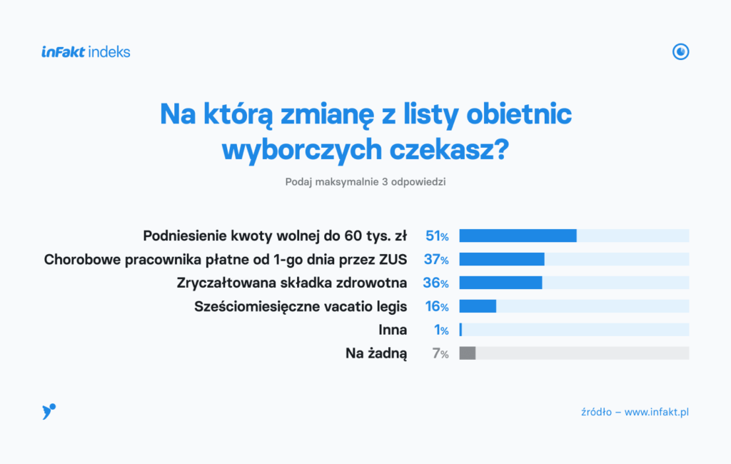 W ósmej edycji inFakt indeksu ponownie zapytaliśmy o realizację obietnic wyborczych. Tak jak przed rokiem, właściciele firm czekają przede wszystkim na podniesienie kwoty wolnej od podatku (do 60 tys. zł), a także na przejęcie przez ZUS wypłaty ubezpieczenia chorobowegood pierwszego dnia czy zryczałtowaną składkę zdrowotną