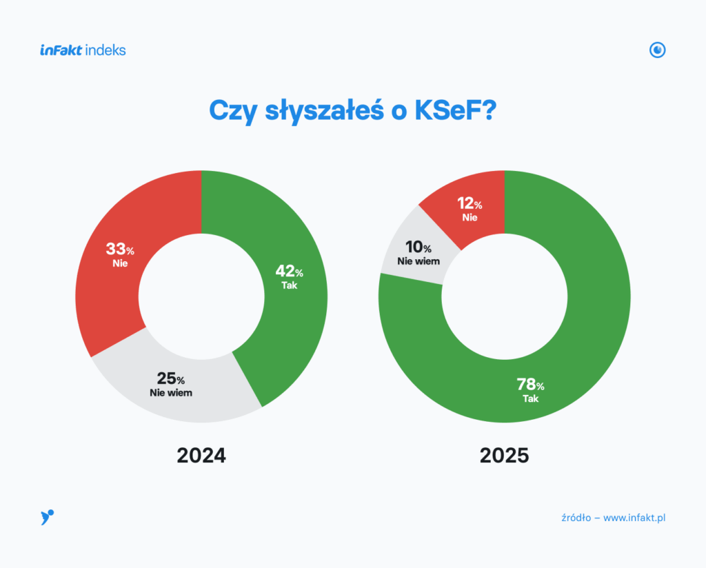 Według ósmej edycji badania inFakt indeks 2025, 78% przedsiębiorców słyszało już o KSeF. To oznacza niemal podwojenie poziomu świadomości względem 2024 roku.