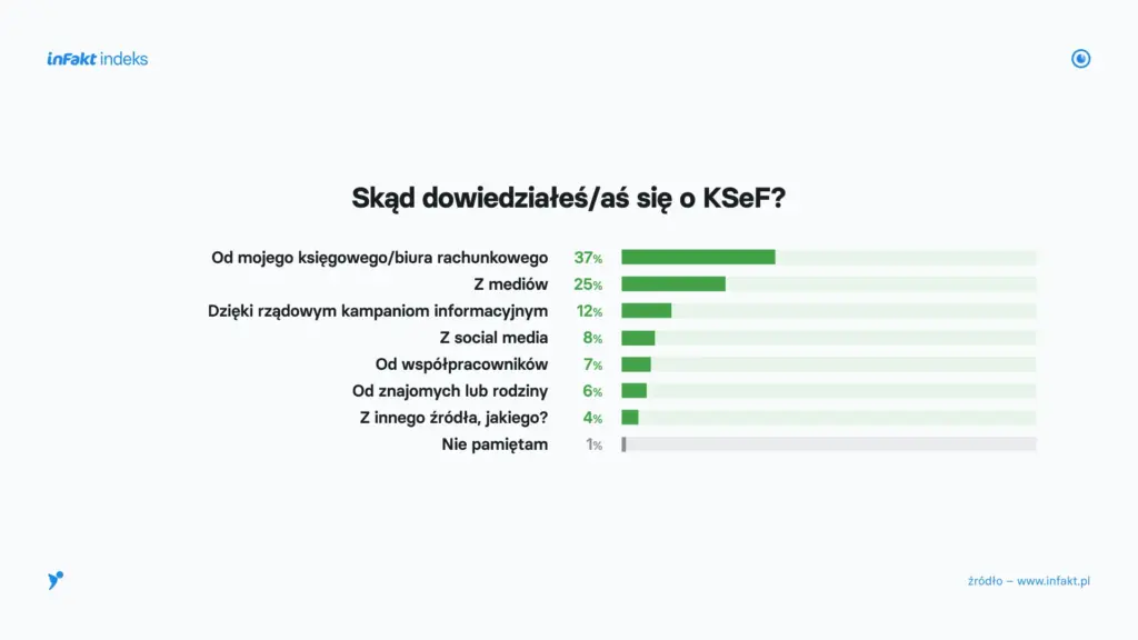 Choć aż 78% przedsiębiorców jest świadomych istnienia KSeF, tylko 45% z nich wdrożyło lub wdraża system, co wskazuje na znaczną lukę między wiedzą a praktycznym zastosowaniem. Główne źródła wiedzy o KSeF stanowią księgowi i biura rachunkowe oraz media, podczas gdy kampanie rządowe pozostają niewidoczne.