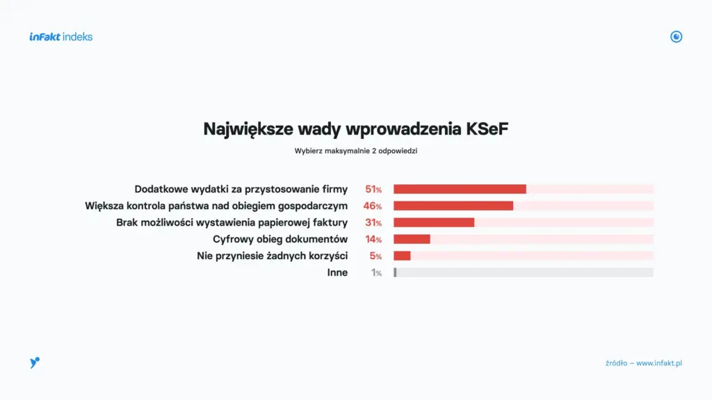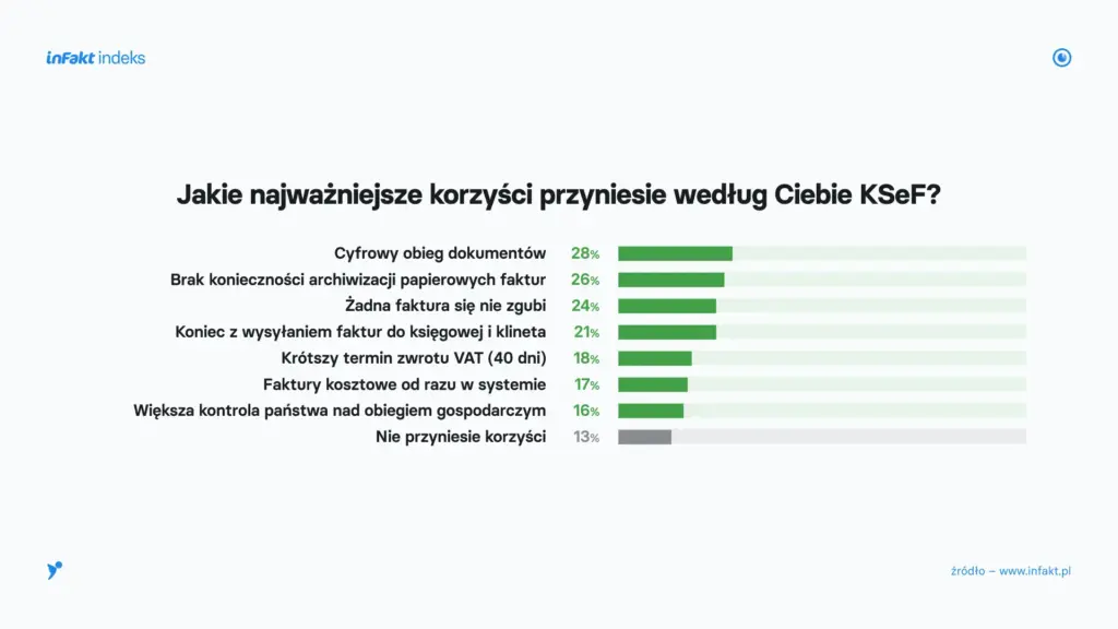 Aż 68% ankietowanych wskazuje, że główną bolączką związaną z KSeF będą nowe wydatki dla firm. 44% firm uważa, że wzrośnie biurokracja. Ankietowani widzą też korzyści, jak cyfrowy obieg dokumentów, koniec z archiwizacją faktur (dzięki e-fakturom) czy ryzykiem ich zgubienia. Niemniej, pozostają sceptyczni.
