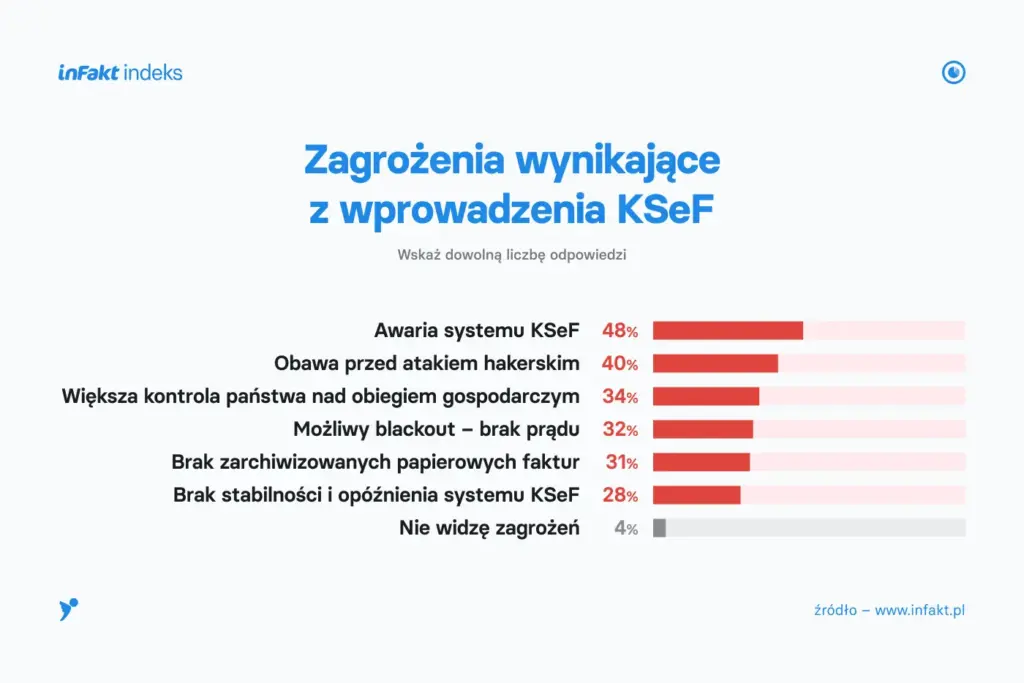 Dominują obawy związane z awariami systemu, możliwymi atakami hakerskimi, brakiem stabilności działania oraz zwiększoną kontrolą państwa nad obiegiem gospodarczym. W efekcie KSeF postrzegany jest dziś bardziej jako źródło ryzyka organizacyjnego niż realne narzędzie upraszczające prowadzenie działalności.