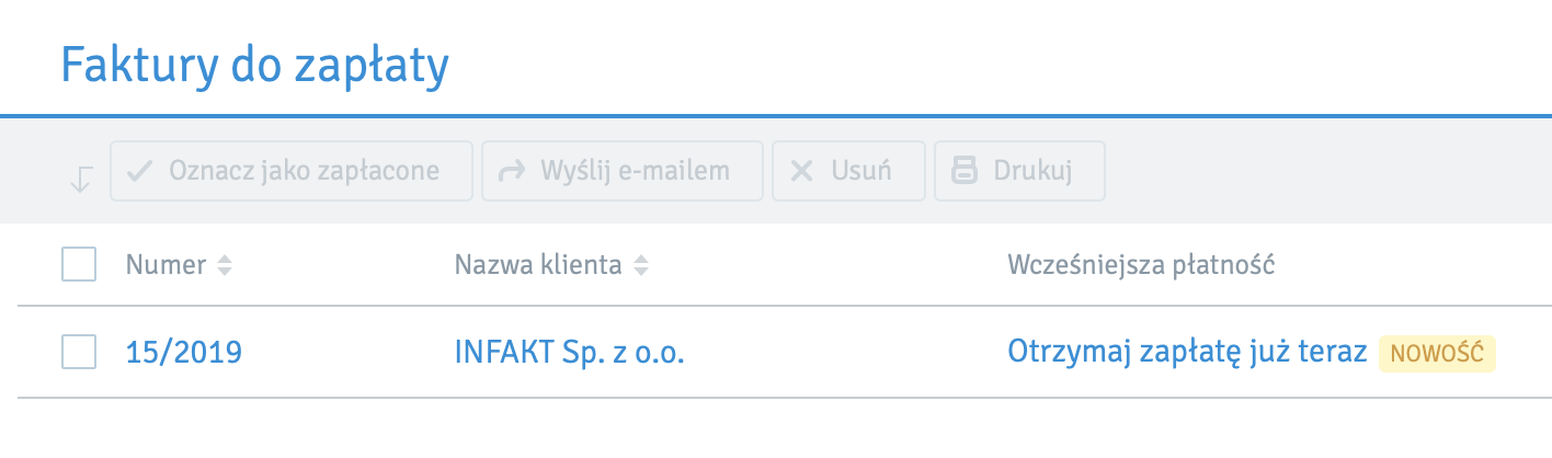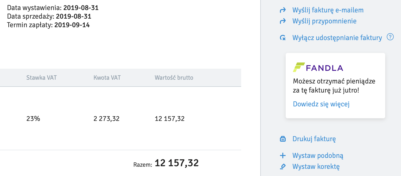 Już teraz uspokajamy/przypominamy. Wystarczy, że wystawiasz faktury z minimum 14 dniowym terminem płatności, na kwotę z przedziału 500 – 30 000 zł, a opcja finansowania z Fandla Faktoring pojawi się przy niej automatycznie.