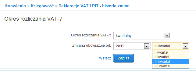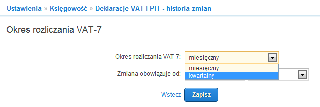 6. W wierszu: Zmiana obowiązuje od, wybierz rok i kwartał, od którego będziesz się rozliczał kwartalnie. A następnie kliknij: Zapisz.
