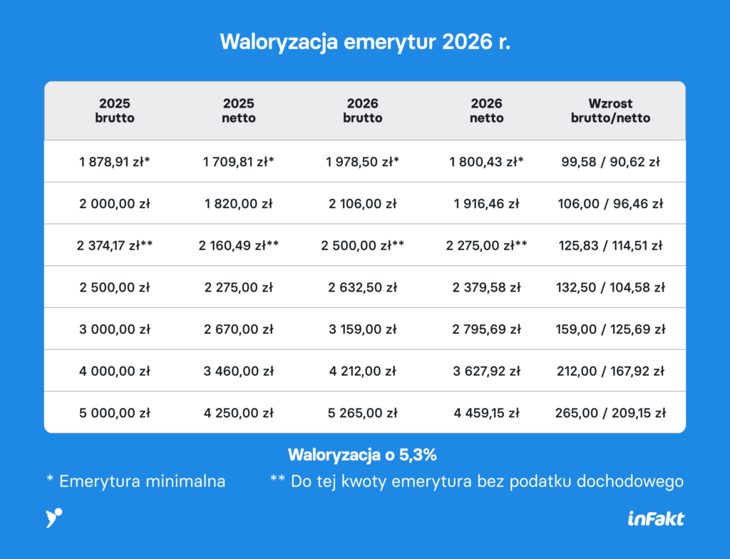 W 2026 r. oznacza to podwyżkę na poziomie 5,3%, czyli realnie – około 90 zł miesięcznie więcej w przypadku najniższej emerytury.