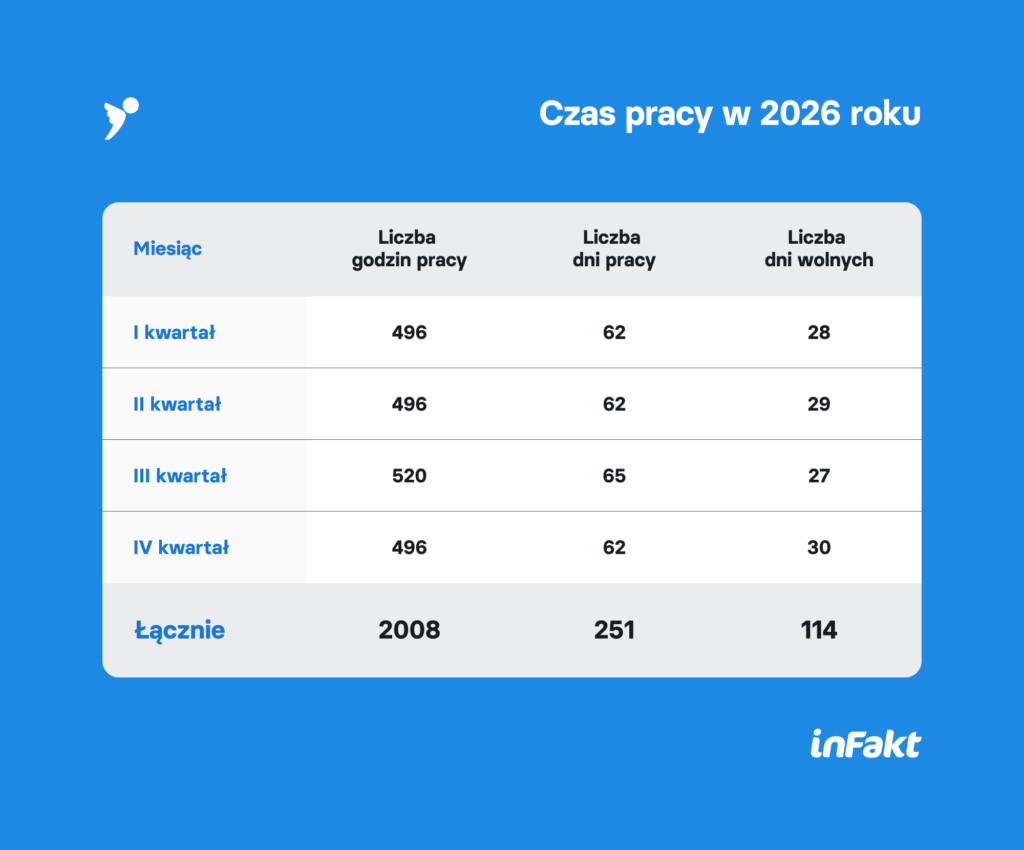 W 2026 roku liczba godzin pracy wyniesie w sumie 2 008. Oznacza to, że przepracujemy 16 godzin więcej niż w roku poprzednim, w którym pracowaliśmy 1992 godziny. Łączna liczba dni pracy wyniesie 251, a dni wolnych 114. W innym artykule opisywaliśmy wymiar czasu pracy w 2025 roku.