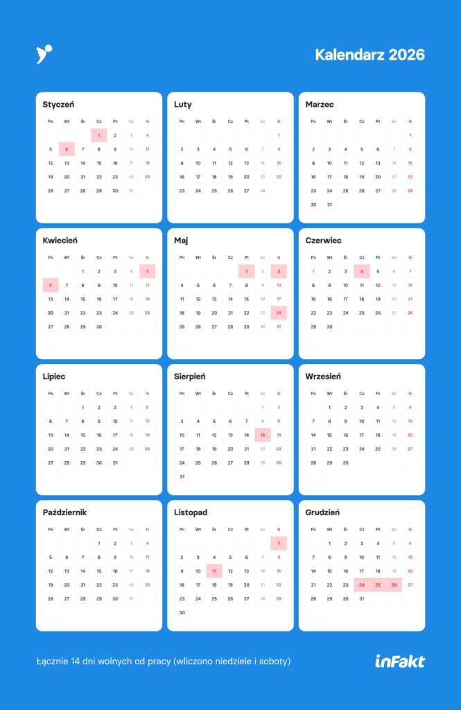 Kalendarz na rok 2026 to przejrzysta grafika, dzięki której bez wysiłku sprawdzisz, kiedy wypadają święta i dni ustawowo wolne od pracy. Jak wspominaliśmy wcześniej – odkąd wolny jest również 24 grudnia mamy ich 14!