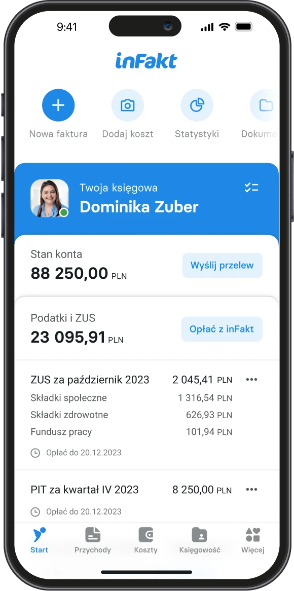 inFakt automatycznie integruje się z KSeF, umożliwiając wystawianie, odbieranie i archiwizowanie e-Faktur bezpośrednio w aplikacji, co upraszcza cały proces i zapewnia zgodność z przepisami. Masz zawsze nasze wsparcie, swojego Księgowego i do dyspozycji specjalną inFolinię KSeF.